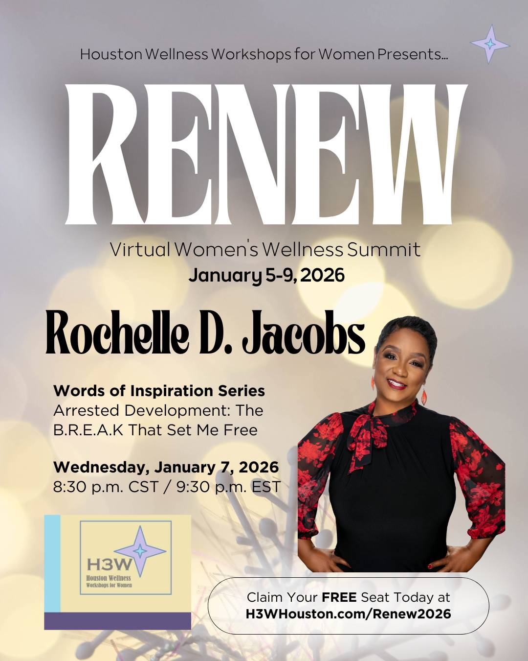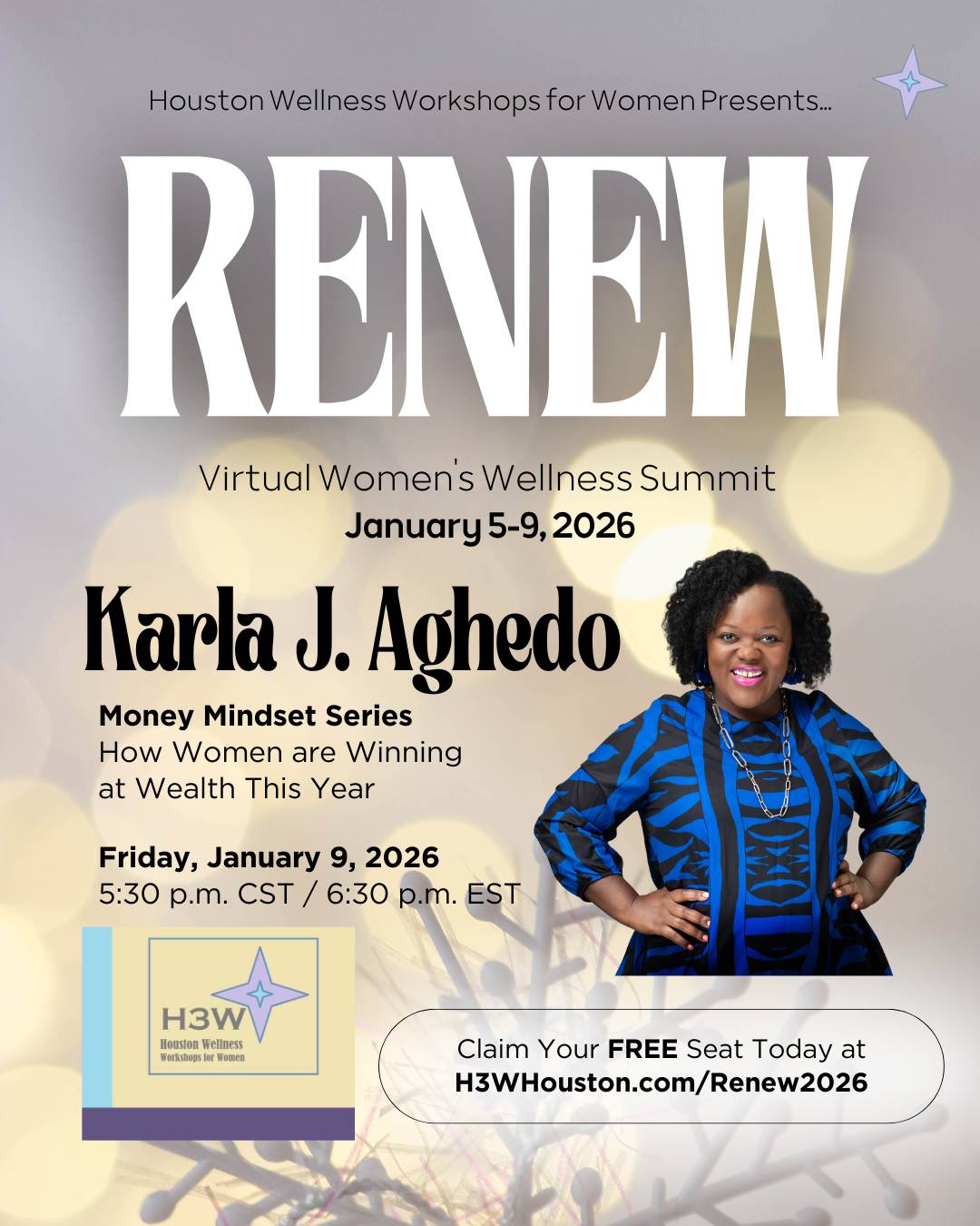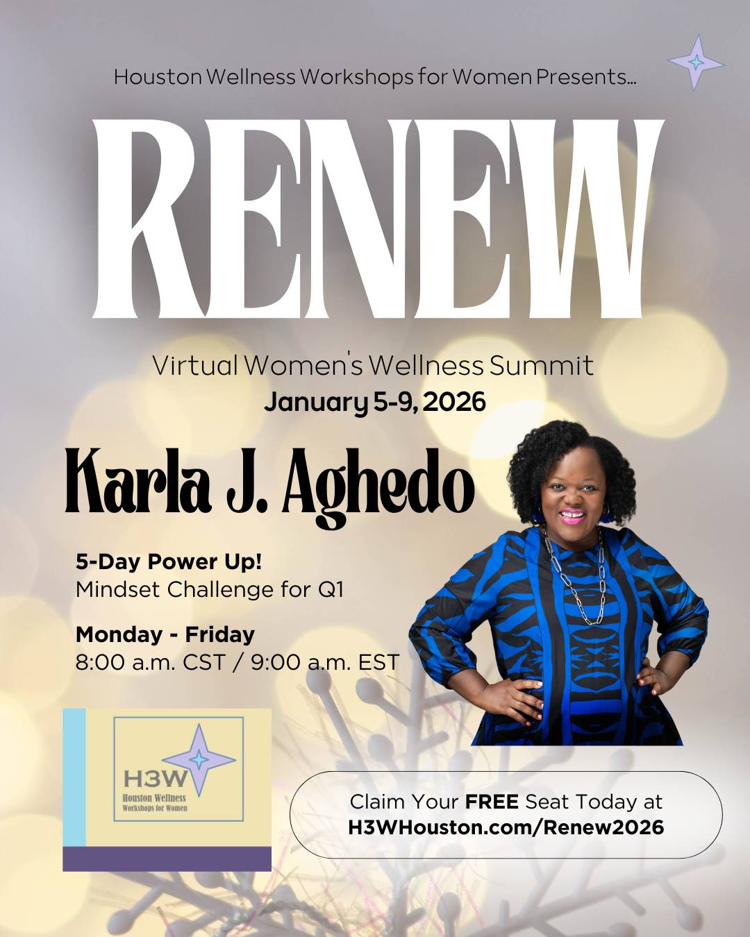 Hosted by Karla J. Aghedo, Attorney and Executive Wellness Mindset Coach, the 5-Day Power Up! Q1 Mindset Challenge starts at 8am CT/9am ET every morning of the Summit in the H3W Chics private Facebook Group (invitation to the group sent after registration).